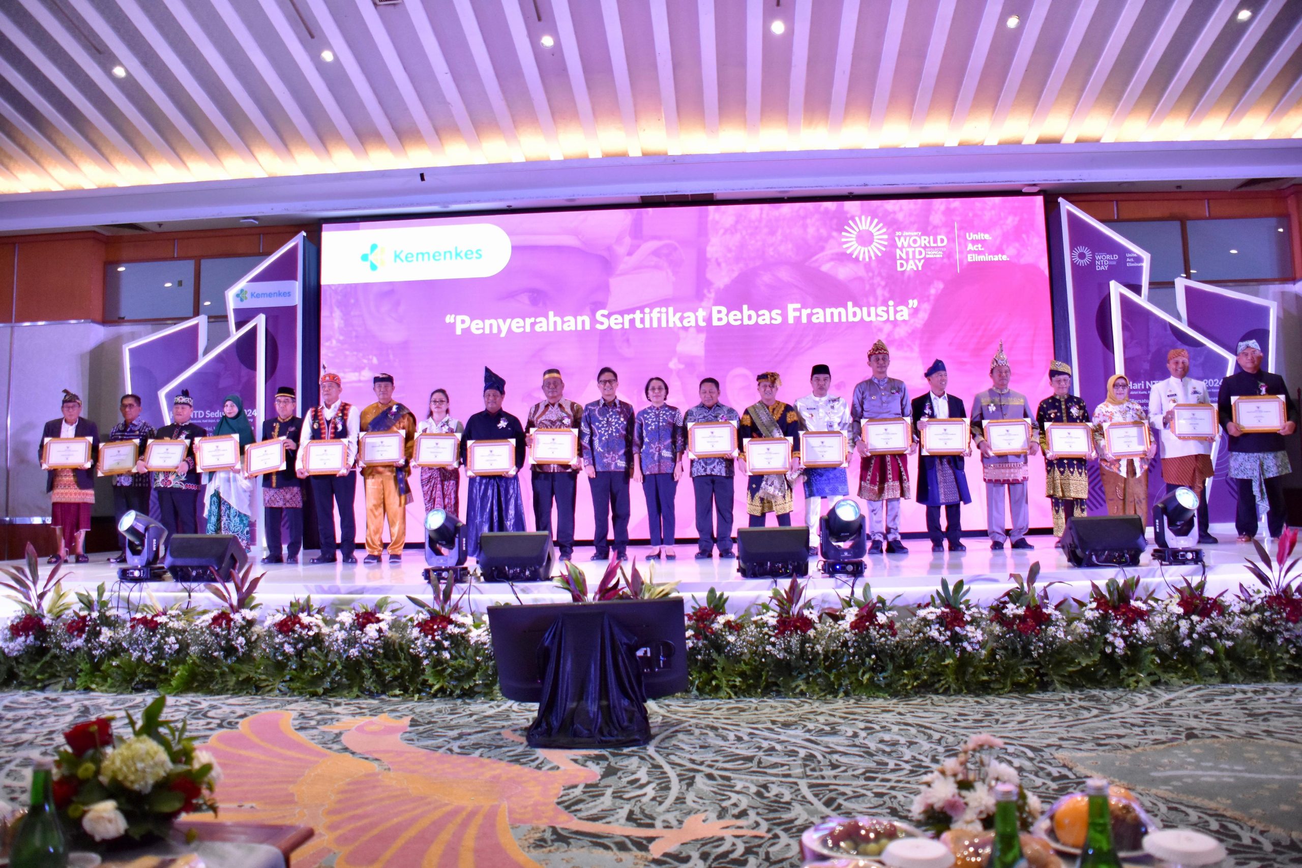 Pada tahun 2024 ini, 102 Kabupaten yang lolos Asesmen dan berhak menerima sertifikat frambusia dan Eliminasi Filariasis yang terdiri dari 99 kabupaten Bebas Frambusia dan 3 Kabupaten Penerima Sertifikat Eliminasi Filariasis.