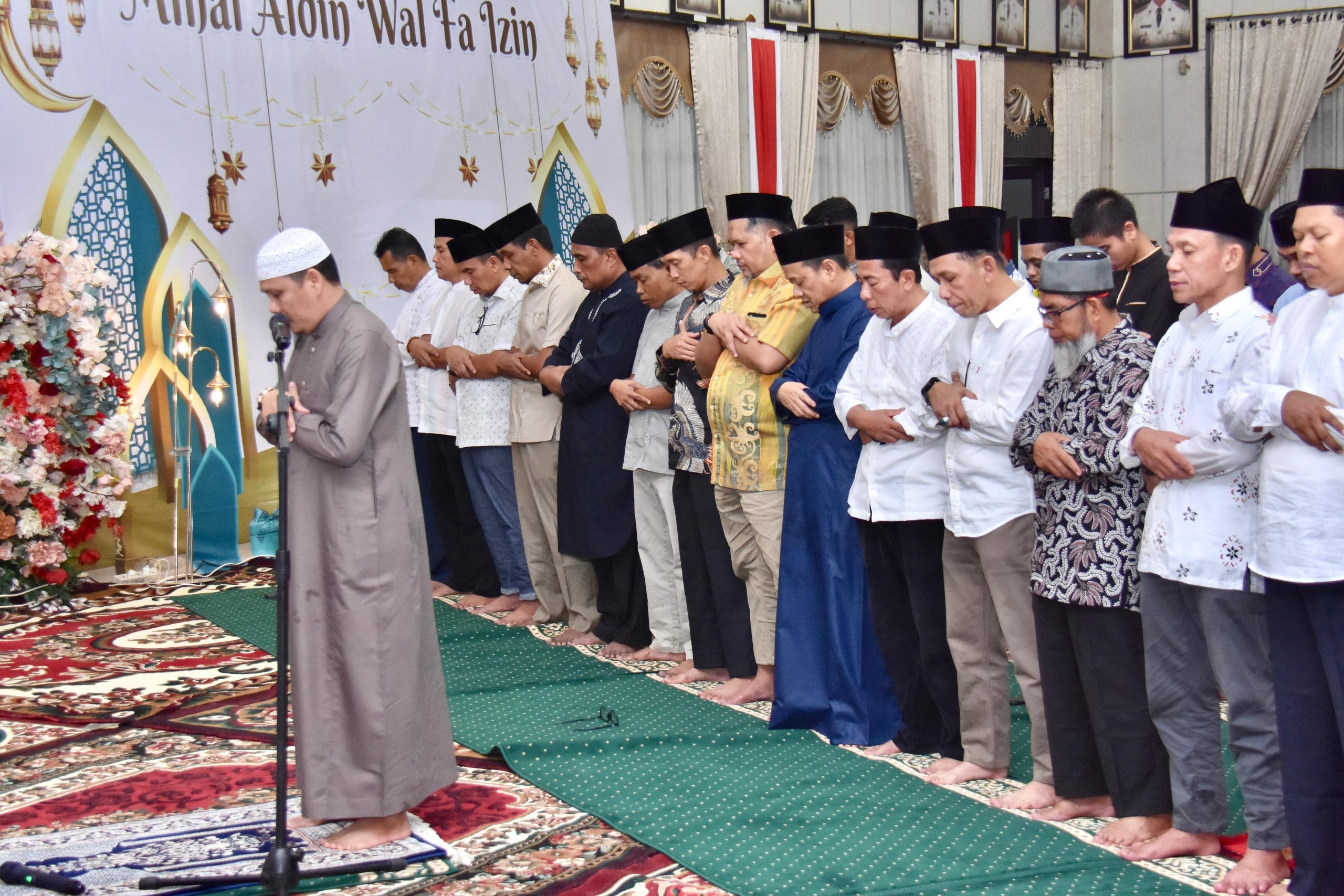 Usai sholat wajib isya menjelang sholat sunat tarawih Pj Bupati Kampar menyampaikan rasa syukur kepada allah swt.“