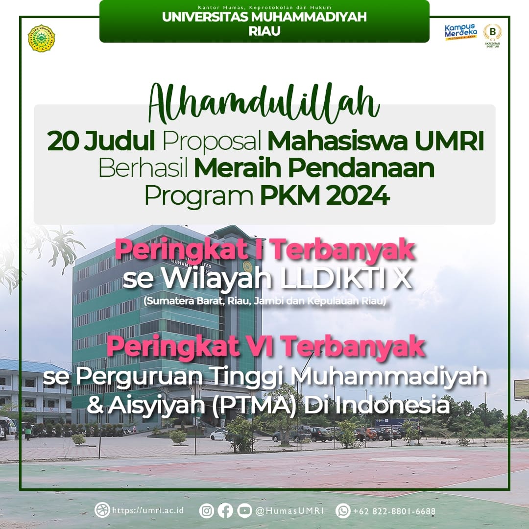 Pekanbaru – Tahun 2024 Universitas Muhammadiyah Riau (Umri) kembali mendulang prestasi di bidang kemahasiswaan, hal ini tergambar dari lolosnya sebanyak 20 proposal mahasiswa dalam program Pendanaan Program Kreativitas Mahasiswa (PKM) Delapan Bidang Tahun 2024.