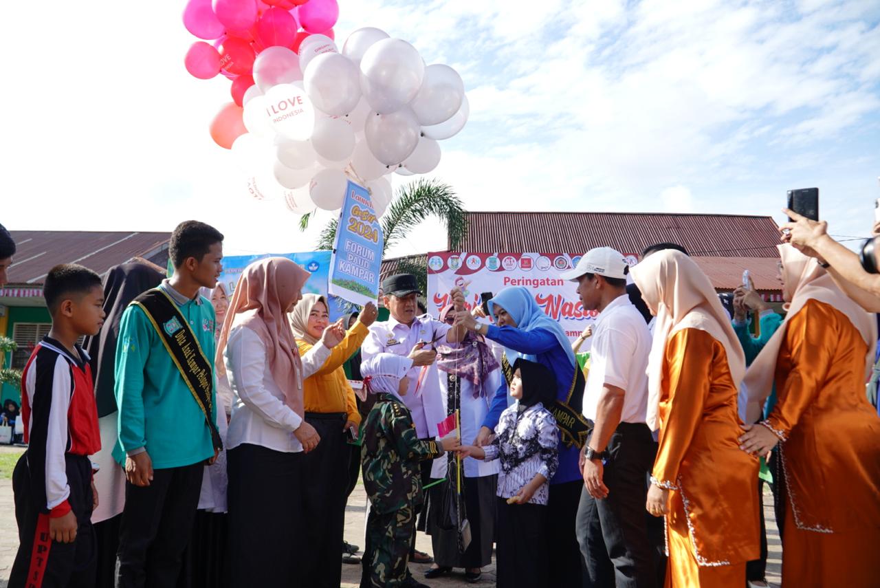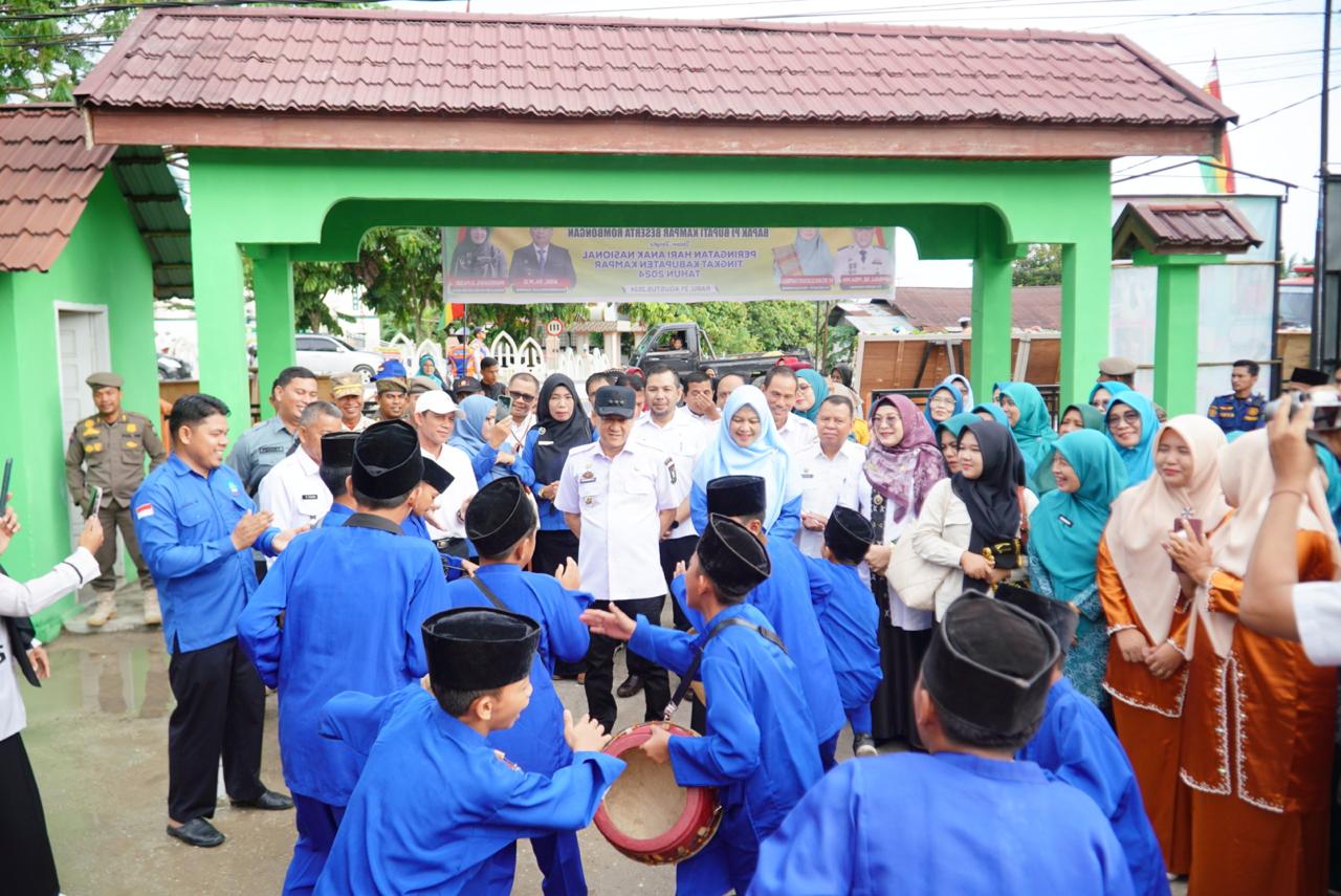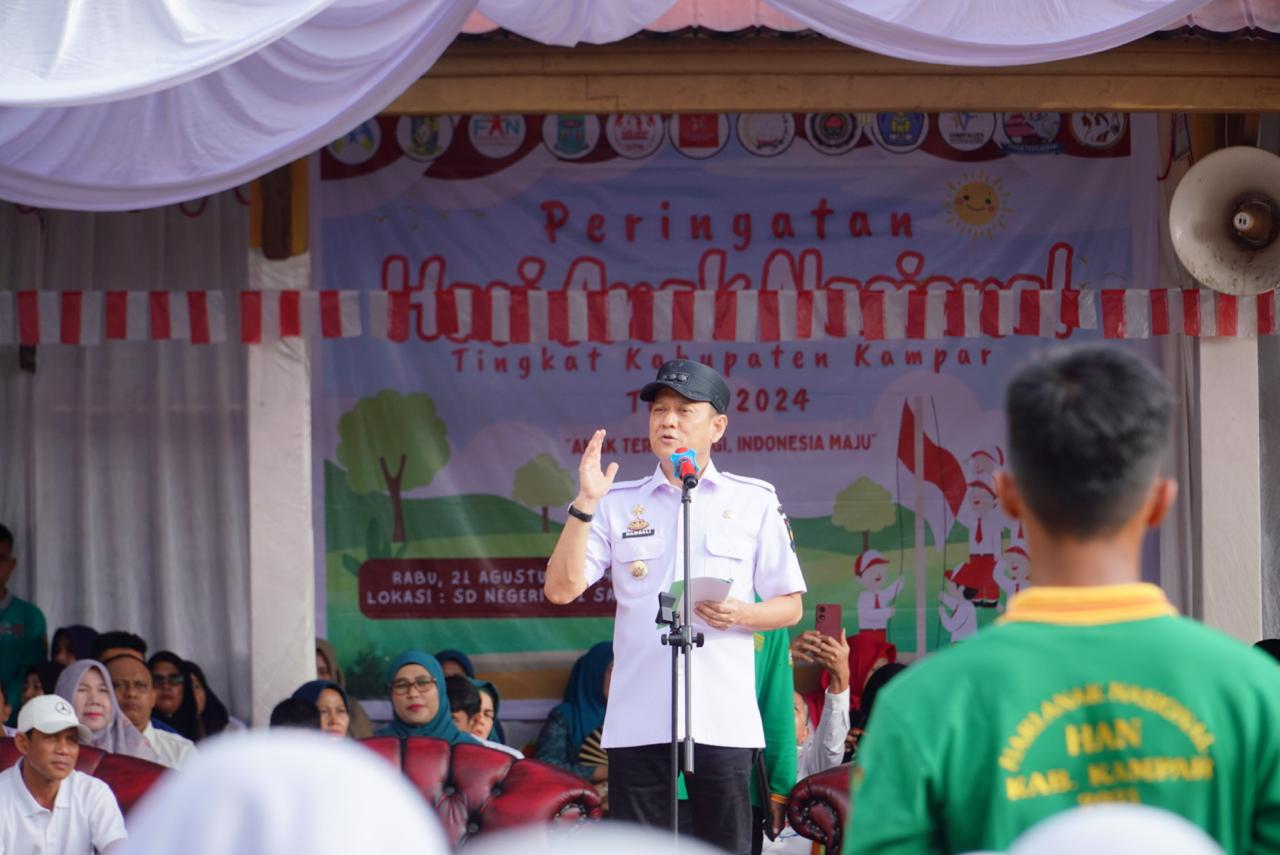 Pj. Bupati Kampar Hambali, SE, MH yang didampingi langsung oleh Pj Ketua TP PKK yang juga sebagai Bunda PAUD Kabupaten Kampar Ricana Djayanti Hambali memimpin Apel Peringatan Hari Anak Nasional ke-40 untuk Tingkat Kabupaten Kampar tahun 2024 di Lapangan Upacara SDN 001 Salo, pada Rabu (21-08-24).