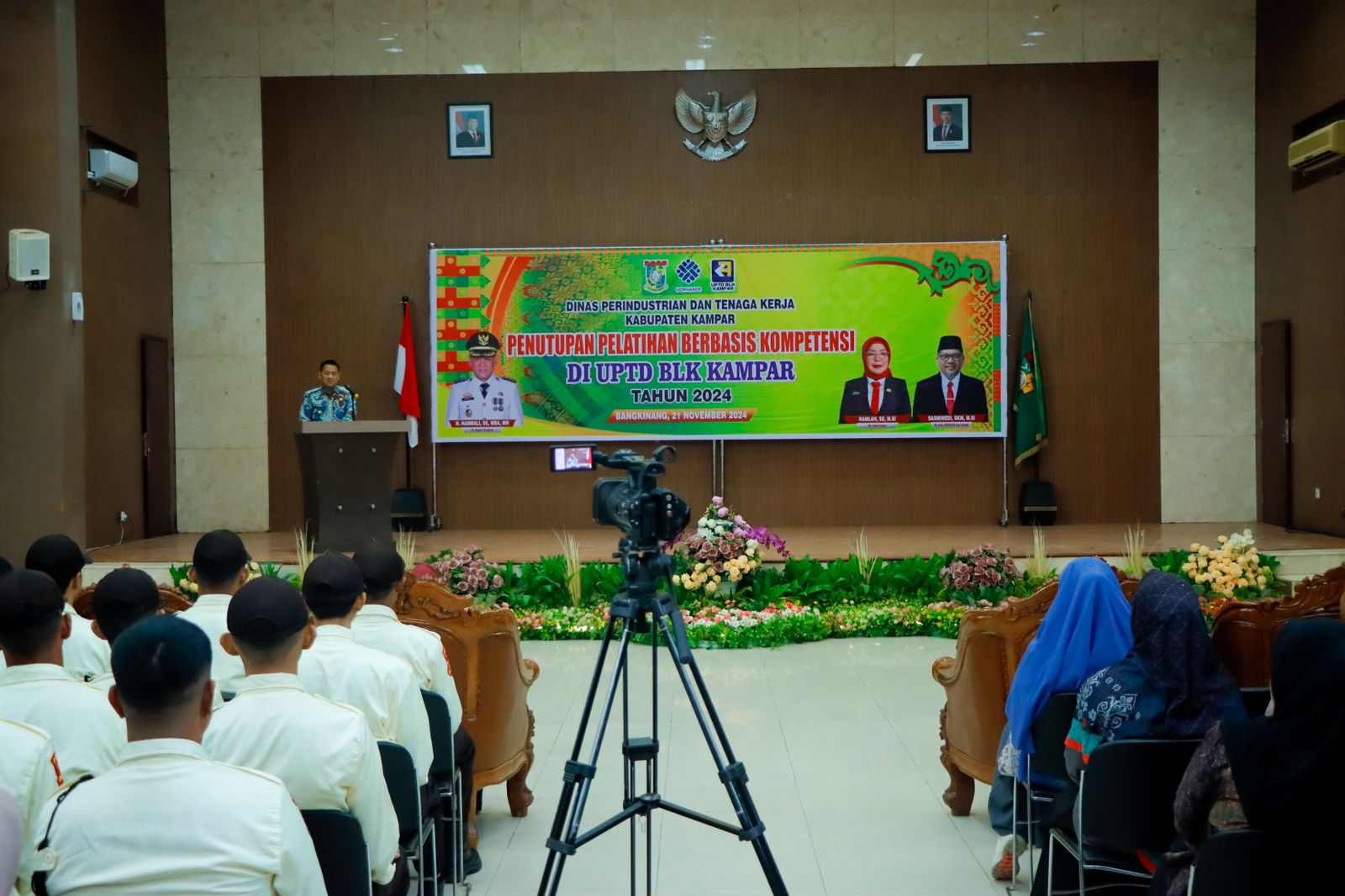 Pj. Bupati Kampar Hambali, SE, MH didampingi oleh Plt. Kepala Dinas Perindustrian Dan Tenaga Kerja Kabupaten Kampar Sasminedi berkenan secara langsung menyerahkan sertifikat tanda telah mengikuti pelatihan kepada para peserta dan menutup secara resmi kegiatan pelatihan tersebut. Acara ini tampak dihadiri oleh Pimpinan OPD di Lingkungan Pemerintah Kabupaten Kampar, Camat se Kabupaten Kampar, Pimpinan BUMN/BUMD di Wilayah Kerja Kabupaten Kampar dan para kepala lembaga pendidikan di Kabupaten Kampar.