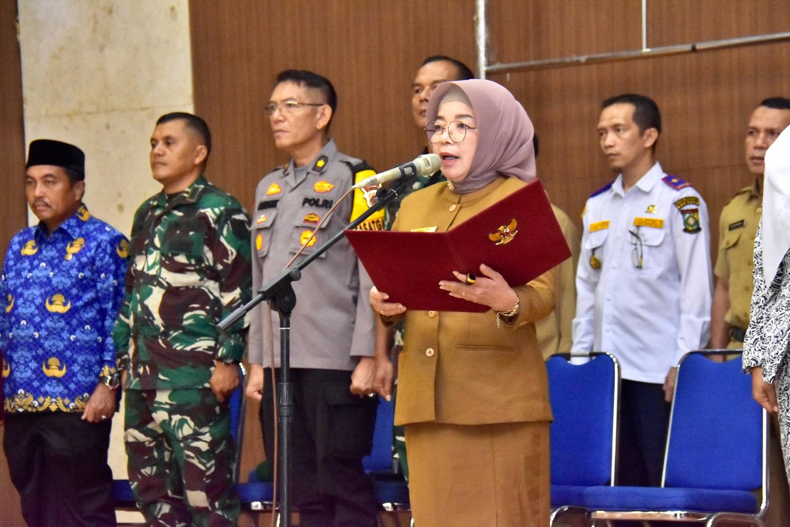 Bangkinang Kota (rina.com) : Dalam rangka Memperingati Hari Ibu ke-96 Tahun 2024, Pemerintah Kabupaten Kampar laksanakan Apel pada hari Senin (23-12-24). yang awalnya akan dilaksanakan di Lapangan Pelajar Bagkinang Kota di alihkan ke Aula Kantor Bupati Kampar karna kondisi hujan. Peringatan Hari Ibu ke-96 ini berjalan dengan khidmat tersebut mengangkat tema Perempuan Menyapa, Perempuan Berdaya Menuju Indonesia Emas 2045.