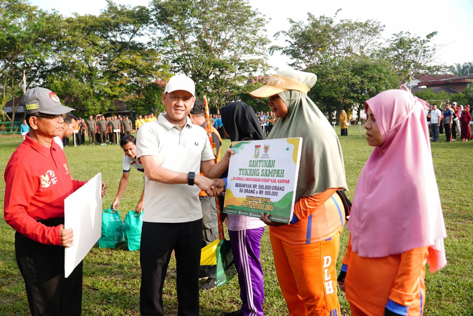 Sebelum melaksanakan goro, Pj Bupati kampar didampingi Pj Sekda Kampar Ramlah,SE,M.Si dan Kadis LH Kampar Yuricho Efril,S.STP,M.Si secara simbolis menyerahkan bantuan uang sebesar Rp 500 ribu, dan paket sembako untuk 50 orang petugas kebersihan. (budi-rls)